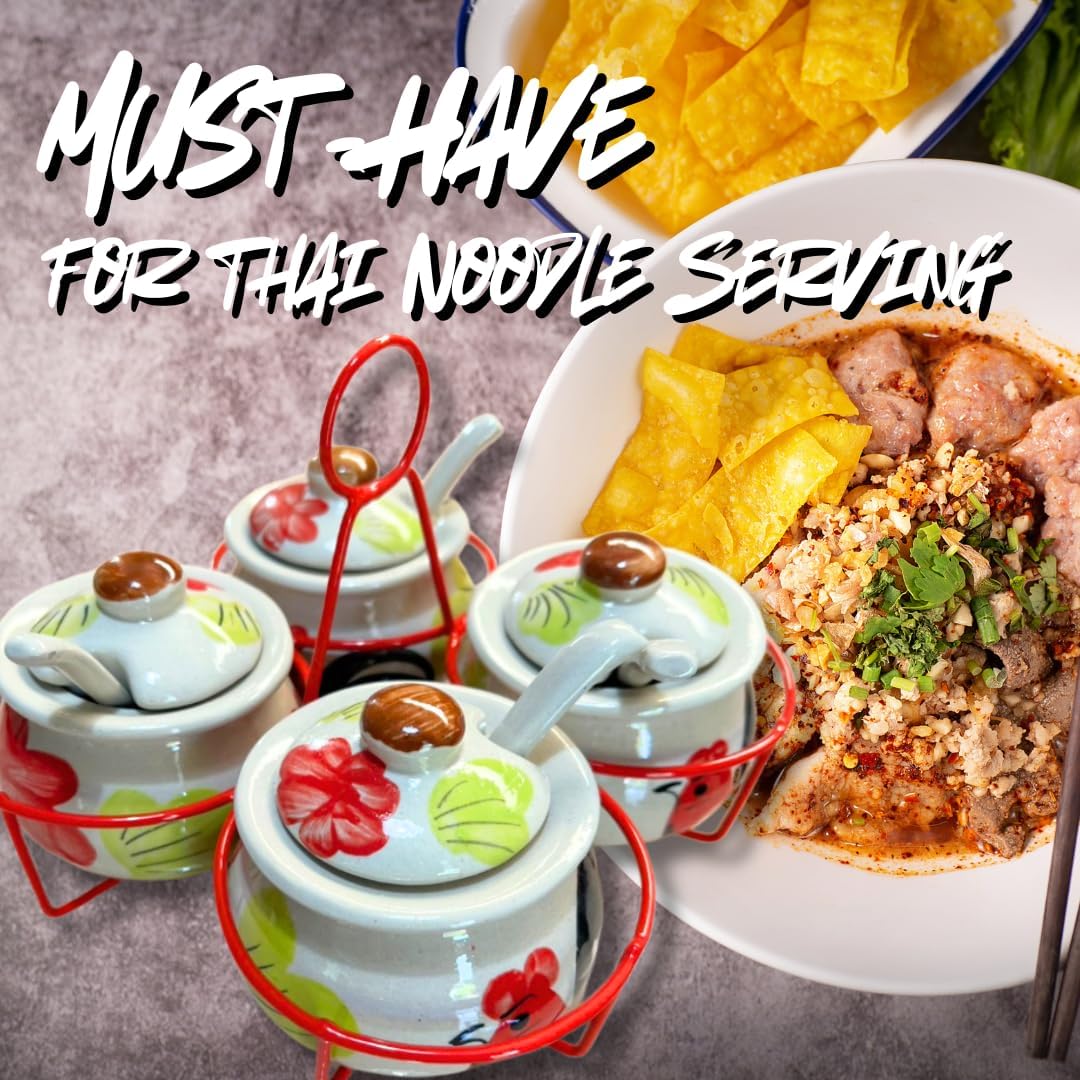 Thai Chicken Pattern Noodle Seasoning Mix Storage Rack – 4 Ceramic Pots Set